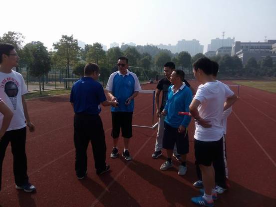 院长唐吉平、党总支书记熊兴吾与教练杨清商讨交接棒技术