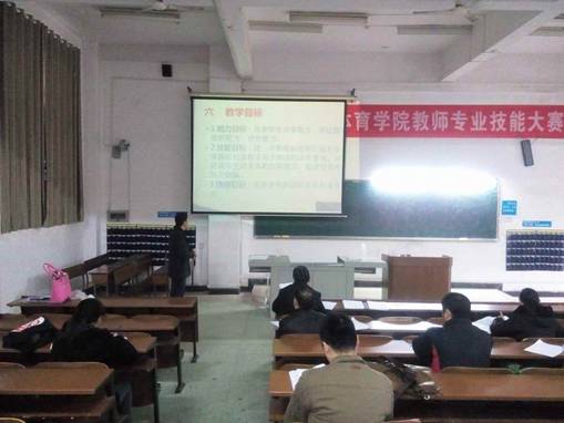 说课、课件制作、粉笔字比赛在一教学楼105教室进行,运动技能展示和特长展示在体育训练馆进行,实验演示在实验室进行。