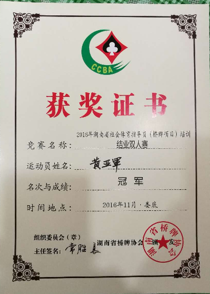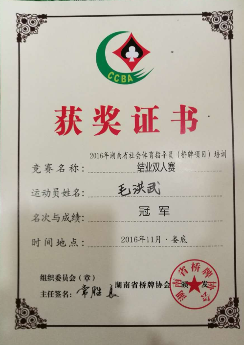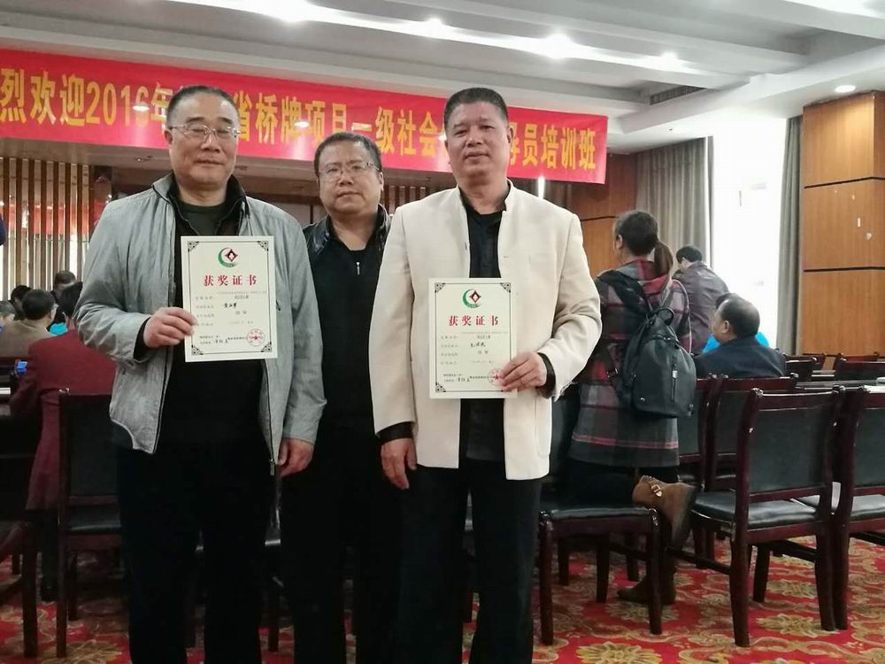 11月12-13日,由湖南省体育局主办,娄底市全民健身中心承办的2016年湖南省桥牌项目一级社会体育指导员培训班在娄底市太阳升国际大酒店举行,培训对象为各市、州桥牌动动员、教练员,各大、中、小学教师,培训内容为桥牌入门、桥牌基础理论(实践)、桥牌的自然叫牌法等。我院熊兴吾、毛洪武、黄亚军三位老师参加了培训,经过考核,三位老师均顺利结业,获得了由省体育局颁发的一级社会体育指导员(桥牌项目)证书,其中,毛洪武、黄亚军还获得了结业双人赛冠军。