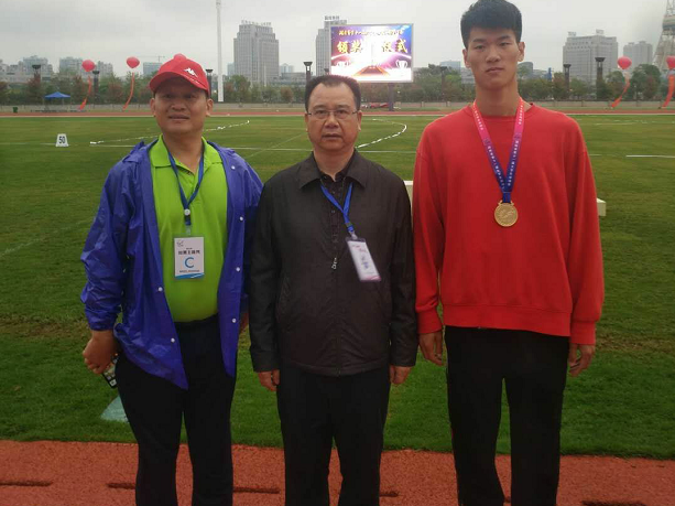 校长李建奇为获得男子十项全能金牌的谭文兵颁奖