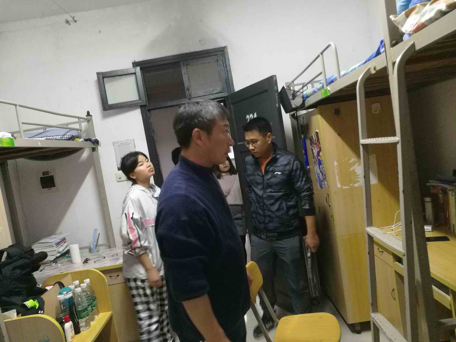 为真正将宿舍管理工作做到落实、落小、落细,10月28日下午17:30—22:00,学院副书记何冬林、副院长副书记郭羽带领辅导员、团学会主要干部从学生宿舍3栋一楼开始,按照“抓核心正学风、强管理促落实、重引导育氛围、树榜样立标杆”的工作思路,一间一间宿舍对内务、地面、墙面、天花板、凉台、厕所的卫生和书的摆放进行指导,特别是暑假装修时地面留下的水泥痕迹,很多学生都说弄不掉,副院长郭羽带着小铁铲和钢丝球,现场示范,将水泥痕迹擦干净,学生看到郭羽老师亲自动手,纷纷动手拿出小刀、钥匙、铁剪刀、抹布等,将宿舍地面擦洗得干净明亮。