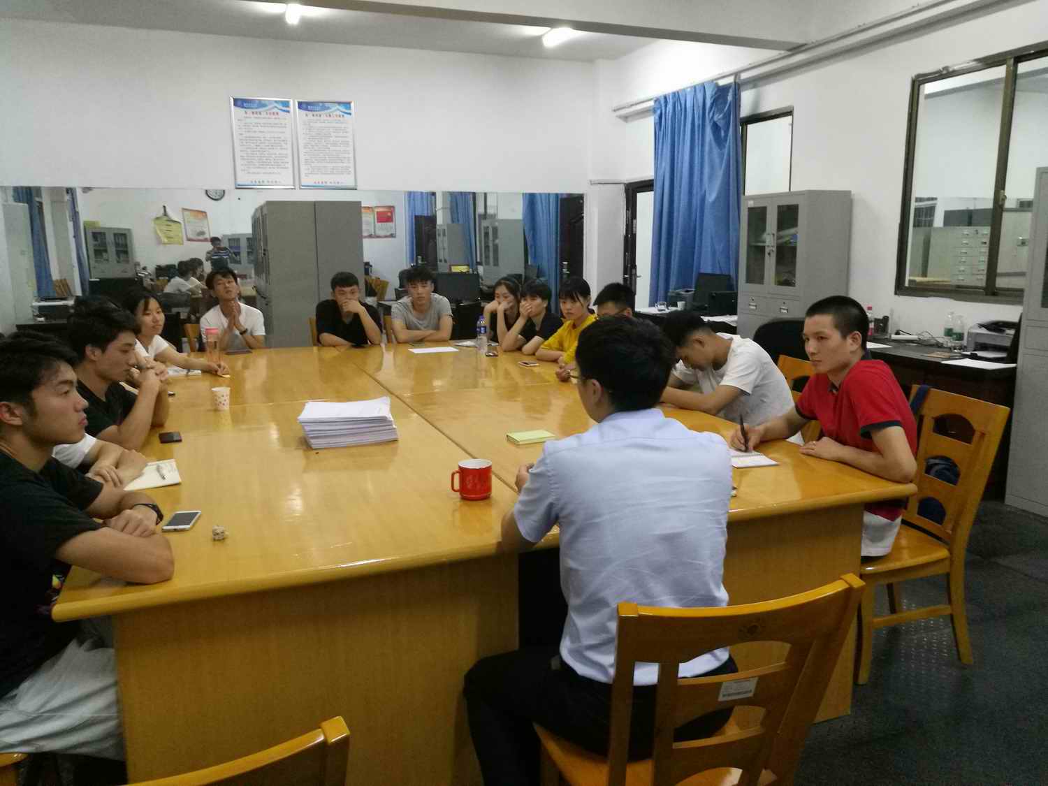 最后,胡院长对同学们提出了几点要求:1.考研是学生自己的事情,考研辅导是老师的一种情结,而不是一种责任,关键还是在自己;2.一旦确定考研,就要坚持下来,不要半途而废,考研复习很苦,要相信,一分耕耘一分收获;3.复习的方式每个人有每个人的特点,不要照搬,要找到最适合自己的复习方式;4.学校选择早作决定,根据自己的实际水平来确定,不要好高骛远;5.考研复习要沉下心来,摒弃一切外界不利因素,全身心的投入;6.希望同学们通过微信、QQ等形式多他交流,不懂的问题随时可以问他。辅导持续到晚上10:30。
