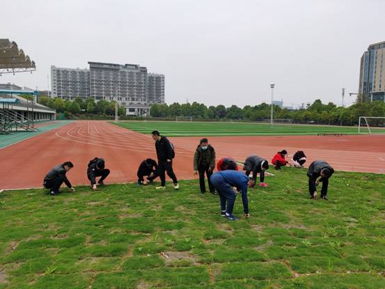 教工两个党支部讨论结束后,许进、欧岳山两位党支部书记组织党员,于下午16:00对学校东田径场内的草坪开展了拔草志愿服务活动。