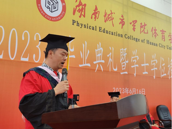 毕业典礼在雄壮的国歌声中拉开序幕。院长李志宏在致辞中向2023届毕业生表达了由衷的祝贺与深情的叮嘱,用体育精神指引前行,用奋斗实干赢得未来,做一名无愧于时代的新青年!毕业生代表张驰慧代表全体毕业生衷心地感谢ok138太阳集团老师们的悉心培养,并对学院及学校表达了深切的祝福和美好的祝愿。副院长许进宣读了ok138太阳集团2023届毕业生获学士学位名单,大学体育教学部副主任欧岳山宣读了ok138太阳集团获省级优秀毕业生名单和校友联络员名单。主席台就坐的导师们为获奖毕业生颁发了荣誉证书,院长李志宏为校友联络员颁发了聘书。