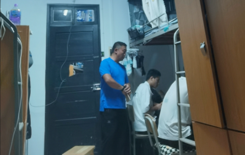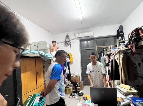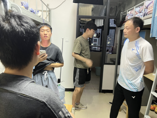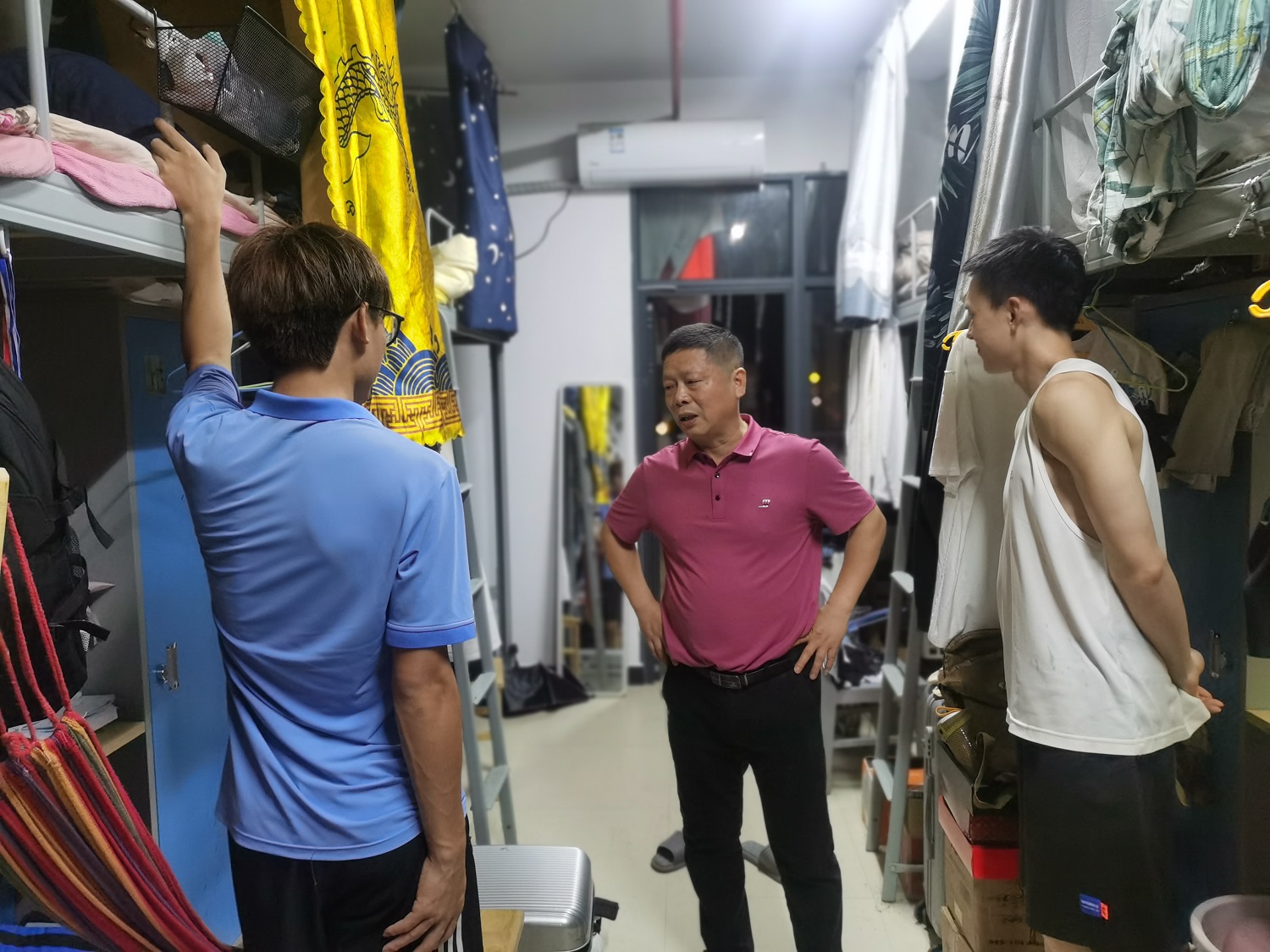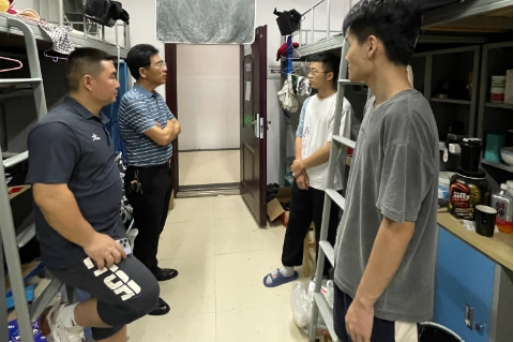 在走访大一、大二寝室时,班主任、辅导员对6人间的拥挤情况进行了解释,希望同学们能理解学校的实际情况,困难是暂时的,相比有些高校,我们学校的宿舍条件还是比较好的,寝室有空调,热水供应正常。看到个别学生玩游戏,对他们进行了批评教育,希望他们在校好好学习,刻苦训练,严格遵守学校的规章制度。