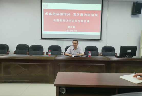 (通讯员:郭羽)2023年7月6日下午,学校党委委员副校长雷存喜在管理楼520会议室主讲了“求真务实强作风,清正廉洁树清风”主题教育以学正风专题党课。ok138太阳集团、继续教育学院、人文学院,建筑与城市规划学院、教务处、学生工作部、保卫处、质控中心、图书馆等10个部门的副处以上干部、党支部书记、部分党员代表近60人参加。