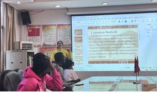 本次武术文化体验课共分三个环节。第一环节为理论课,廖玉美老师全程用英语给同学们介绍了中国武术内涵、武术礼仪、中国武术在加纳的传播、中国功夫电影明星以及加纳特有的武技,加深学员对中国武术文化的理解。