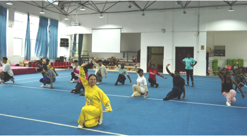 第二个环节为技术授课。学员们在加纳大多没有参加过武术课程学习,因此,本次授课主要选取了相对简单的武术长拳基本动作组合教学。学员们虽然身体不太协调,动作不够美观,但是在老师的鼓励和引导下,一个个热情高涨,努力配合老师完成每招每式的学习。