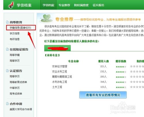 3、注册登陆后在学信档案——》学籍信息(图像校对)菜单即可看到自己的学籍信息(图像校对)信息。----图像校对-----开始校对-----如果无误就点“正确”.