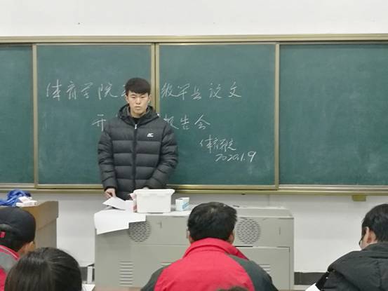 会前,郭羽副院长召开各答辩小组组长会议,统一规范答辩要求,对答辩老师提了五点要求:一是每一位答辩老师依据学生开题材料报告向答辩学生提问,问题不能少于3个,答辩秘书记录提问与学生回答问题的内容不少于3个;二是老师所提出的问题或给予的建议要有针对性,要紧扣学生毕业论文(设计)题目内容,要有利于学生论文(设计)的完成;三是控制好答辩时间,每位学生陈述论文(设计)的时间不超过三分钟,陈述的内容主要包括选题的意义、研究现状、主要研究内容、研究方法等,答辩小组专家进行提问并现场给予指导,时间控制在五分钟左右,每位学生答辩总时间不超过十分钟;四是答辩结果要公开、公平、公正,不能有意降低标准或故意为难学生;五是每组秘书收集齐全开题答辩的存档材料,组长于放假之前签好字,及时交龚勋老师保存。社会体育指导与管理专业系主任汤华、体育教育系主任许进对参加答辩的学生做了强调:一是要沉着冷静,不要急躁;二是要充分相信自己,回答老师的提问不慌不忙;三是要对答辩老师提出的意见和建议认真做好记录,回去以后在指导老师的指导下进行修改,四是要按要求及时上交相关材料。