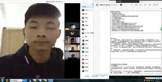 14:30分,学生分成四个组,每个组均是利用腾讯会议进行开题答辩。副院长郭羽、体育教育系主任许进进入线上答辩课堂,对每组线上答辩进行巡查,以保证学生、老师认真对待线上开题答辩。在答辩过程中,学生非常认真,答辩老师尽心尽责,为学生提出了很多很好的建议,师生均认为,这种答辩形式非常好,完全能够保证开题答辩质量。各组答辩安排如下: