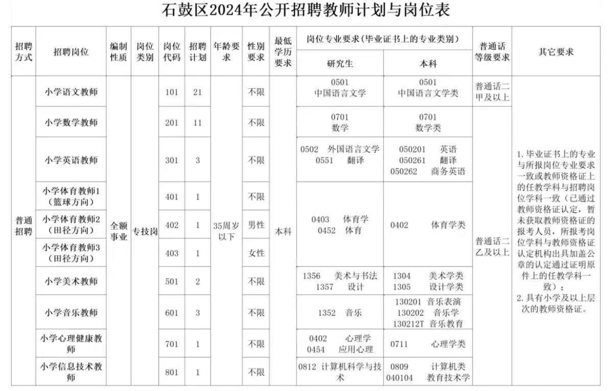 此次公开招聘小学教师45名。具体招聘岗位及条件详见《石鼓区2024年公开招聘教师计划与岗位表》(附件1)、《石鼓区2024年公开招聘教师岗位明细表》(附件2)。