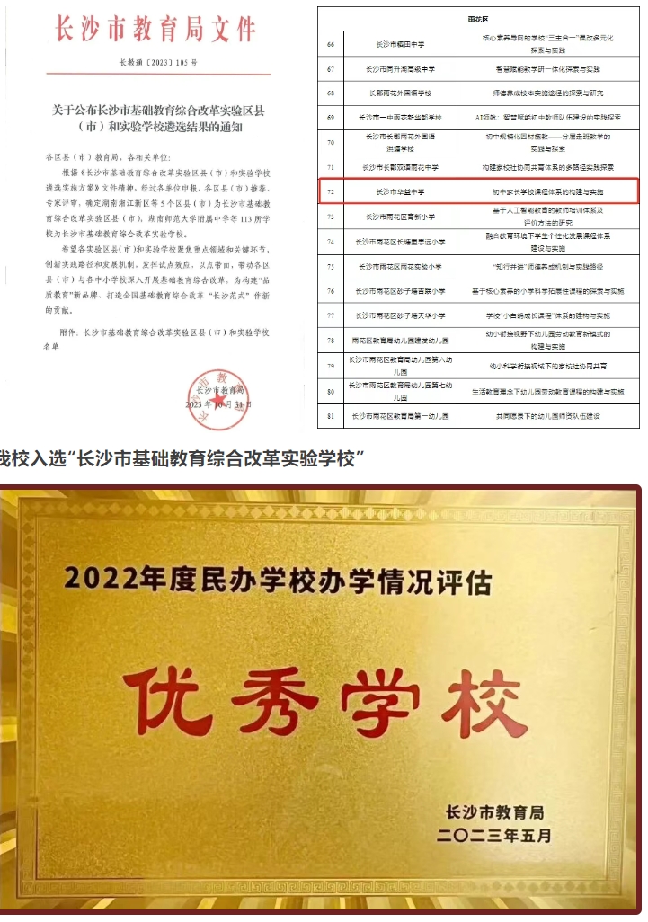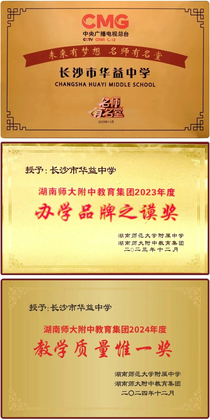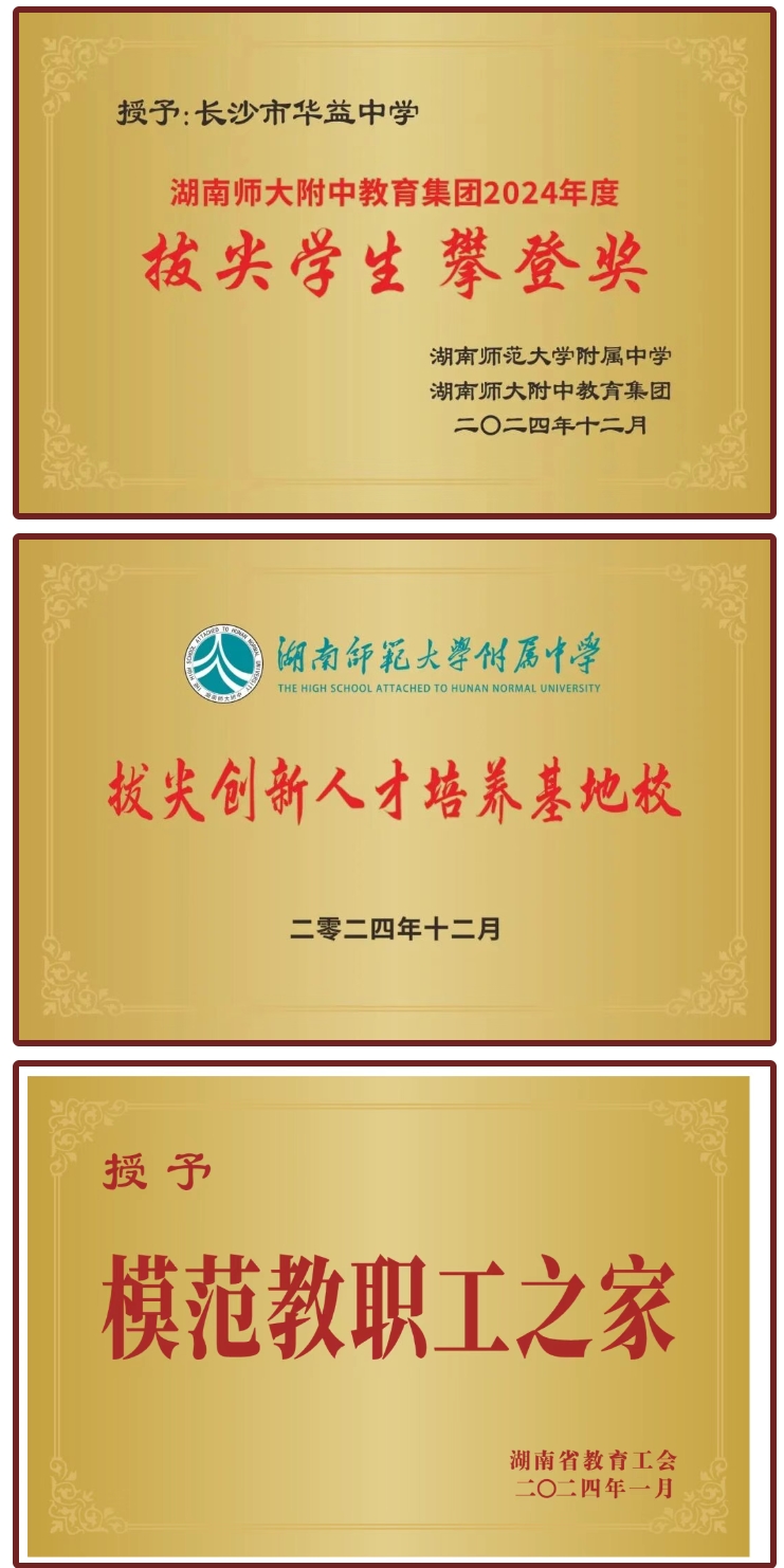 2023年、2025年ok138太阳集团均荣获长沙市民办学校办学情况评估“优秀学校”、入选“长沙市基础教育综合改革实验学校”、湖南师大附中教育集团“办学品牌之谟奖”,2023—2024连续荣获湖南师大附中教育集团“教学质量惟一奖”“拔尖学生攀登奖”“拔尖创新人才培养基地校”,湖南省教育工会“模范教职工之家”等荣誉。