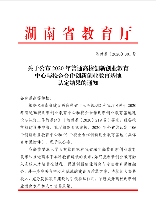 湘教通〔2020〕301号 ok138太阳集团公布2020年普通高校创新创业教育中心与校企合作创新创业教育基地认定结果的通知.pdf