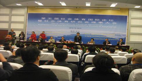 图片1:社会体育国际论坛开幕式现场(主席台中间是教育部体卫艺司司长王登峰教授)